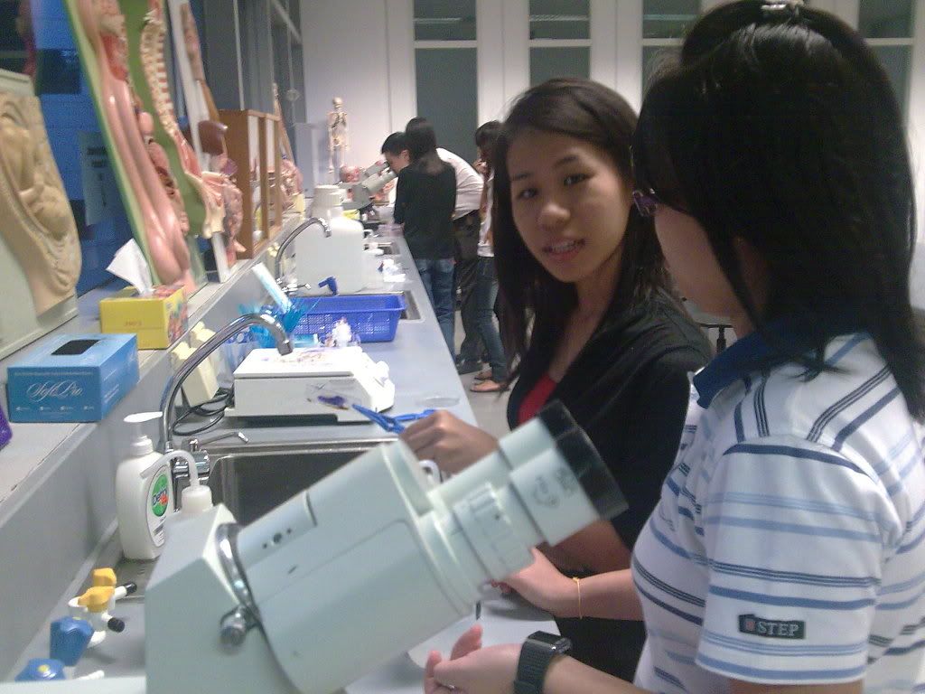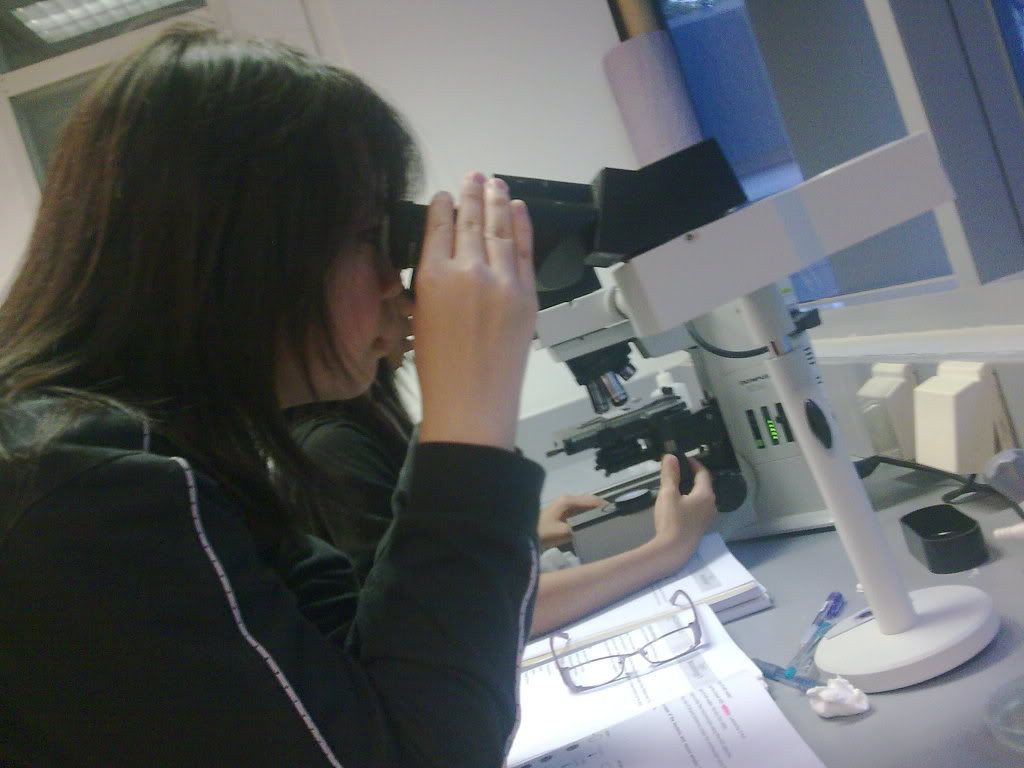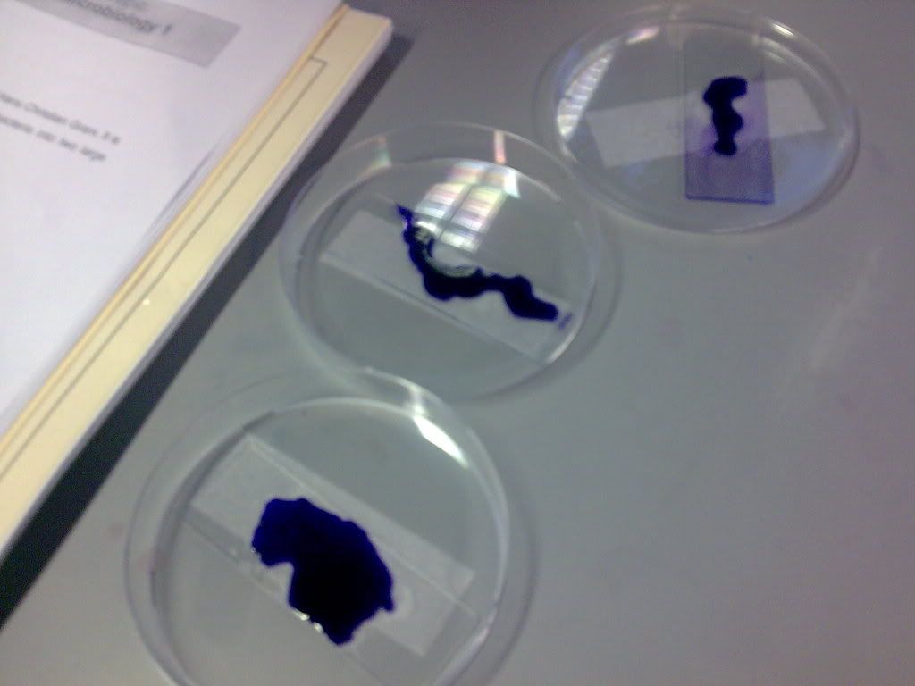 Okay now, if there's something that will screw me up big time, it's not shits, but it's Biology. The one module that I can never build chemistry with. I don't know if it's Biology or it's me and my-not-working brain cells. Nonetheless, I survived freaking 4 hours of Biology lesson today (2hrs of lecture + 2hrs of lab). It's Microbiology and we dealt with bacteria under the microscope. Gram staining. Gram +(ve) vs Gram (-)ve. Purple and Pink. Very tidious experiment indeed and we get no satisfaction with the end result. pfft.